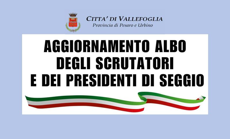 Gli elettori del Comune di Vallefoglia interessati ad essere iscritti nell’albo degli scrutatori di seggio elettorale, sono invitati a presentare domanda entro il 30 novembre 2025, il termine per la cancellazione è da considerarsi sempre entro il 30 novembre 2025. Per informazioni rivolgersi all’ufficio elettorale (tel. 0721489711) oppure consultare il sito del Comune di Vallefoglia.
