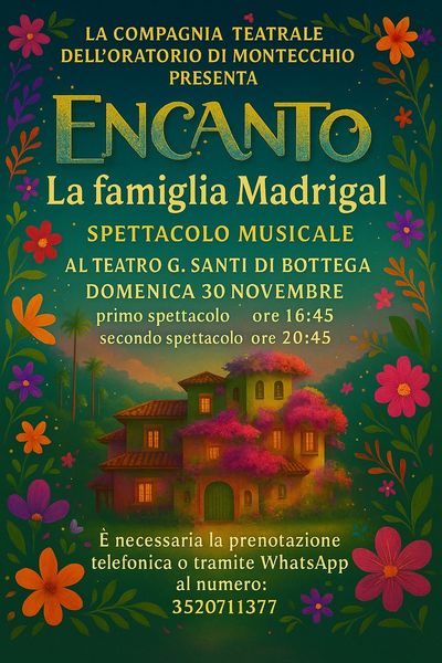 “Encanto” è un musical liberamente ispirato al celebre film d’animazione Disney e sarà interpretato da un cast di giovani attori, ballerini e cantanti dell’Oratorio Santa Maria Assunta di Montecchio. La compagnia, attiva dal 2004, porta avanti con passione la missione di avvicinare al teatro ragazzi e adulti, offrendo al pubblico spettacoli ricchi di energia, musica e colori, capaci di emozionare spettatori di tutte le età.