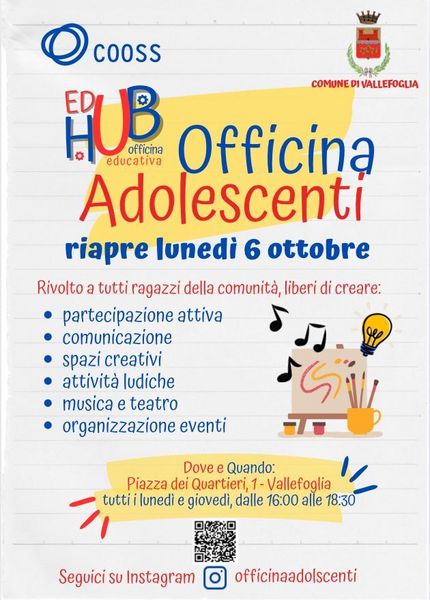 Il Sindaco del Comune di Vallefoglia, Sen. Palmiro Ucchielli, e l’Assessora alle Politiche Sociali, Dott.ssa Francesca Sparaventi, informano la cittadinanza che presso “Edu Hub - Officina Educativa”, in Piazza dei Quartieri a Montecchio, riapre le porte “Officina Adolescenti”, lo spazio pensato per accogliere e accompagnare i giovani della comunità in un percorso di crescita, espressione e socializzazione.