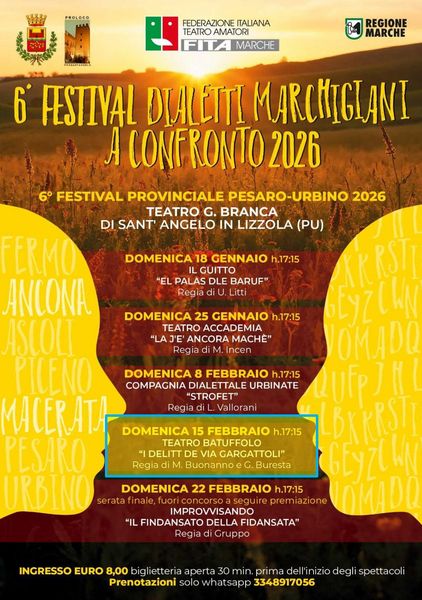 Il Sindaco del Comune di Vallefoglia, Sen. Palmiro Ucchielli, e l’Assessore alla Cultura, Dott. Mirco Calzolari, comunicano che domenica 15 febbraio 2026, alle ore 17.15, il Teatro “Branca” di Sant’Angelo in Lizzola ospiterà il quarto appuntamento del Festival dei Dialetti Marchigiani a Confronto.