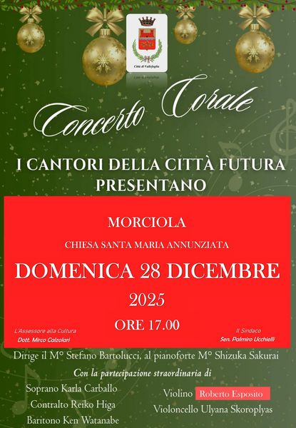 Il Sindaco della Città di Vallefoglia, Sen. Palmiro Ucchielli, e l’Assessore alla Cultura, Dott. Mirco Calzolari, informano la cittadinanza che domenica 28 dicembre 2025, alle ore 17.00, presso la Chiesa di Santa Maria Annunziata di Morciola, si terrà un concerto corale a cura del coro “I Cantori della Città Futura”.