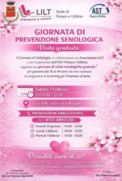 Il Sindaco della Città di Vallefoglia, Sen. Palmiro Ucchielli, e l’Assessore alle Politiche Sanitarie, Dott.ssa Francesca Sparaventi, informano la cittadinanza che il Comune di Vallefoglia, in collaborazione con l’Associazione LILT – Lega Italiana per la Lotta contro i Tumori – e con il patrocinio dell’AST di Pesaro e Urbino, organizza una giornata interamente dedicata alla prevenzione oncologica.