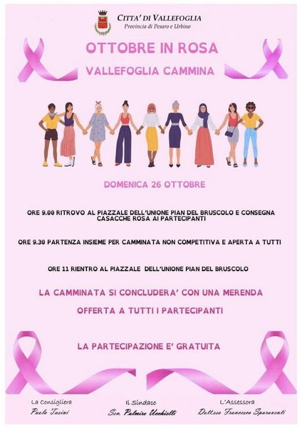 "In occasione dell'Ottobre Rosa, mese dedicato alla prevenzione e cura del carcinoma mammario, il Comune di Vallefoglia organizza la Prima Camminata solidale adatta ed aperta a tutti, per sensibilizzare la cittadinanza sull'importanza di adottare consapevolmente stili di vita sani, incoraggiandola a fare controlli preventivi e periodici, al fine di migliorare la propria qualità della vita. Saranno presenti la scrittrice Ivonne Pagliari e la Dott.ssa Sandra Mancini. L'appuntamento è per Domenica 26 Ottobre alle ore 9:00 presso il piazzale dell’Unione dei Comuni Pian del Bruscolo, da cui partirà la camminata assieme. Il rientro è previsto per le ore 11 e terminerà con un momento conviviale.